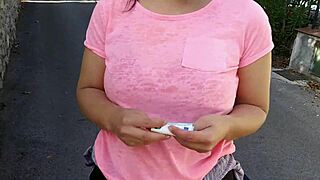 The horny brunette college student flashes her natural tits then sucks cock close-up on the risky street